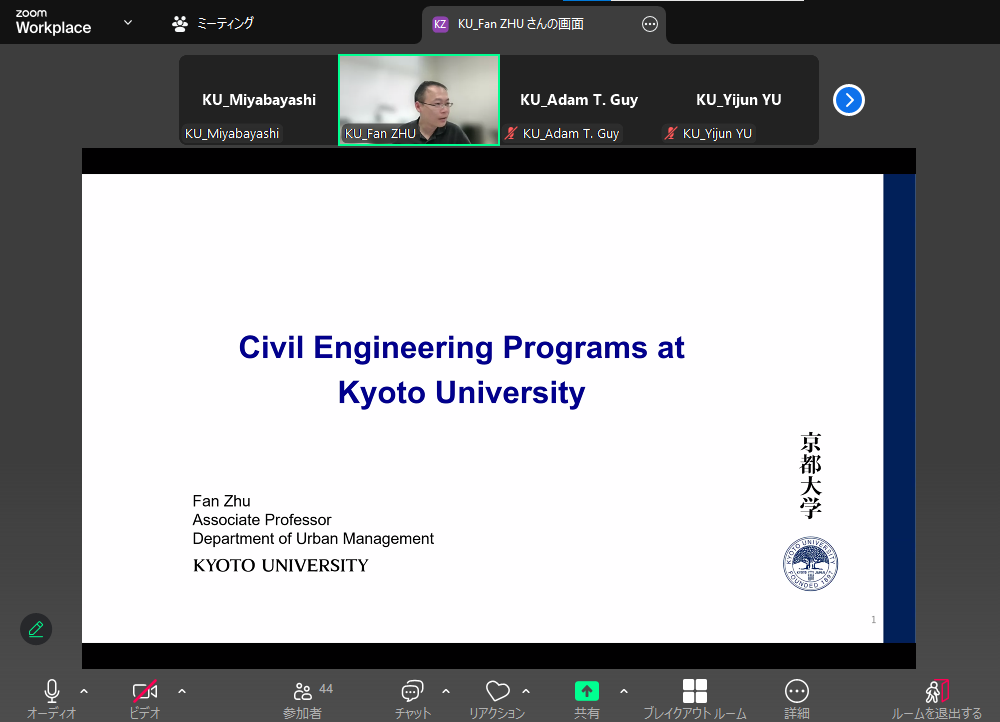 本学からは、ASEAN拠点の縄田拠点所長、経済学研究科・久野教授とYu Yijun特定助教、工学研究科・Zhu准教授および生命科学研究科・Guy准教授が参加され、本学の優先配置枠を有する国際コースについて参加者に説明しました。